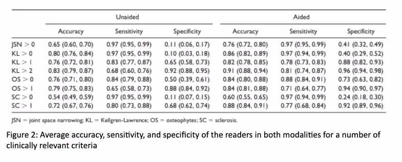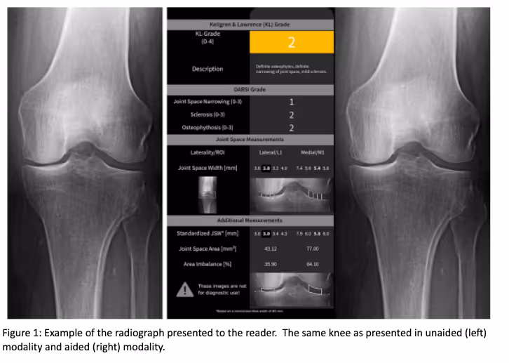 In a study assessing diagnosis accuracy between unaided and AI-aided osteoarthritis diagnosis, KOALA reduced the false positive rate with little to no loss of true positive rate. Results show that the increase in accuracy of physicians is driven by an increase in specificity and sensitivity allowing physicians to better recognize the early stages of osteoarthritis.