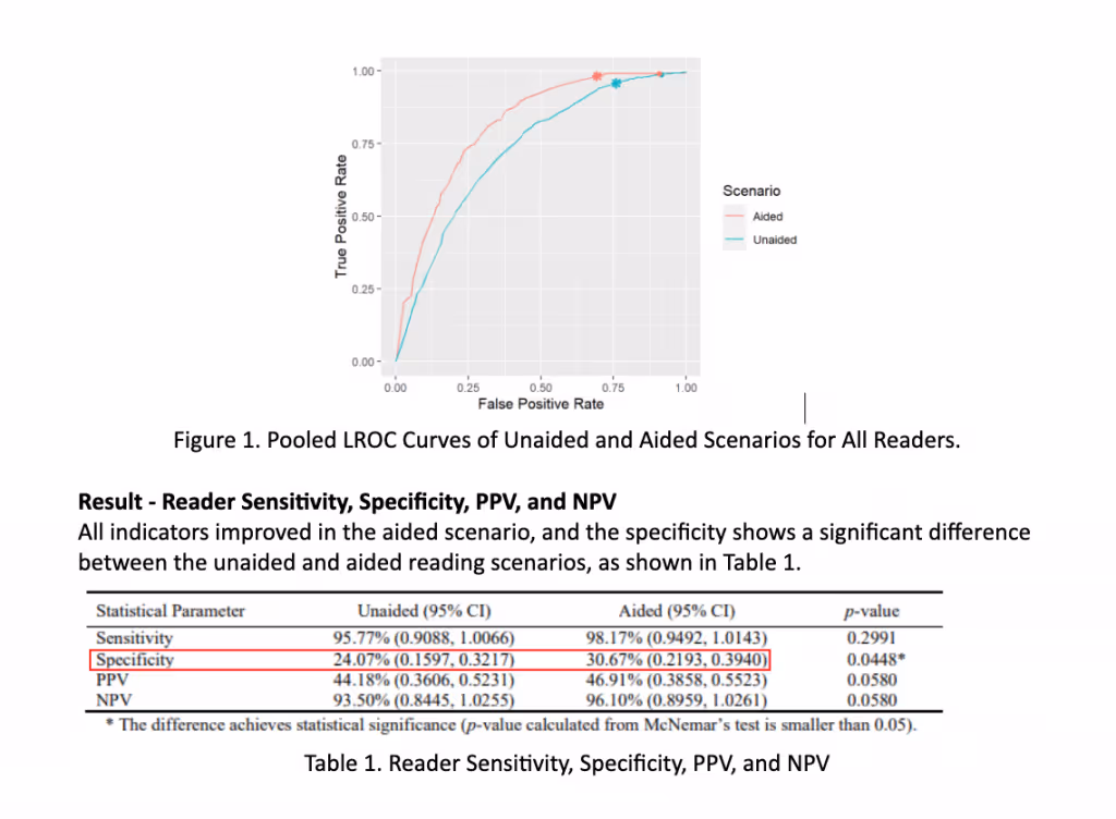 With the AI system assistance, readers have a higher diagnostic performance with an increased average AUCLROC from 0.7582 to 0.8294, which is statistically significant, as shown in Figure