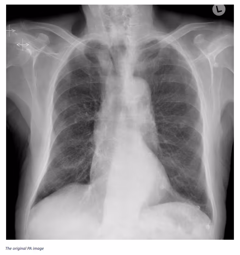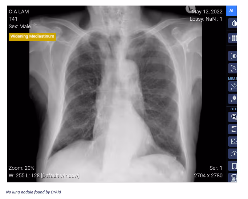 Ferrum Health partners with best-in-class AI providers offering solutions designed to reduce radiology workload and improve patient care.VinBrain Case Study: Distinguishing Lung Nodule from Other Easily Confused LesionsIntroductionConfusion in distinguishing between similar-looking findings on x-ray images is a problem that can be encountered by physicians (e.g., sclerotic rib lesions can mimic pulmonary nodules). The key is to look at prior radiographs. If the nodule remains projected over exactly the same rib site despite projectional differences then the physician can be confident that the lesions are within the rib rather than the lung.Clinical CaseAn 85-year-old male patient presented to the hospital with “Recent TAVI (transcatheter aortic valve implantation). A chest x-ray was required with both AP and PA views, then CT. After screening these images, a nodule was projected in the left mid-zone. The nodule “moves'' relative to the lung but remains directly associated with the anterior aspect of the left fourth rib on both the PA and AP projections. This indicated that the lesion is associated with the rib, which was confirmed by looking at the patient’s prior TAVI planning CT. Finally, based on CT images, the physician confirmed the Sclerotic lesion within the anterior aspect of the left 4th rib.