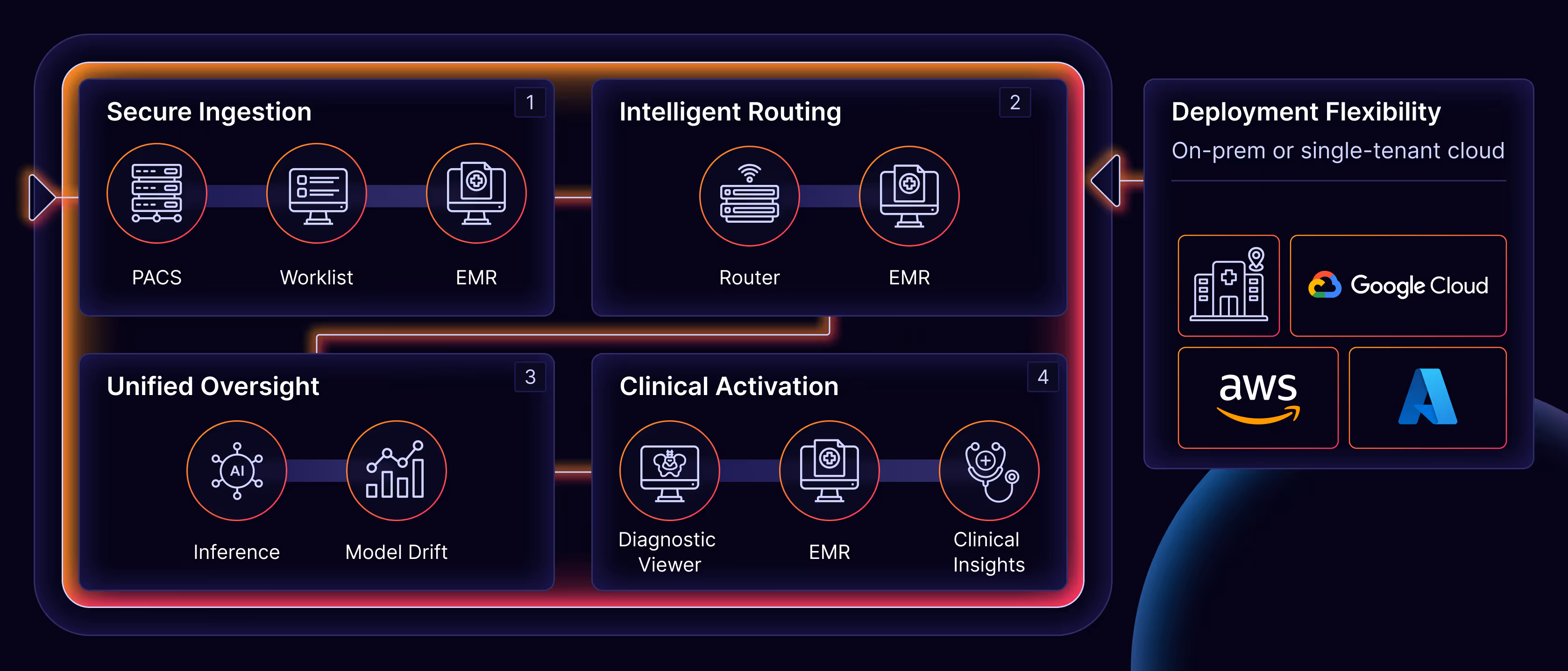 Integrate once with EMR, PACS, and reporting, then deploy any approved model across service lines.
